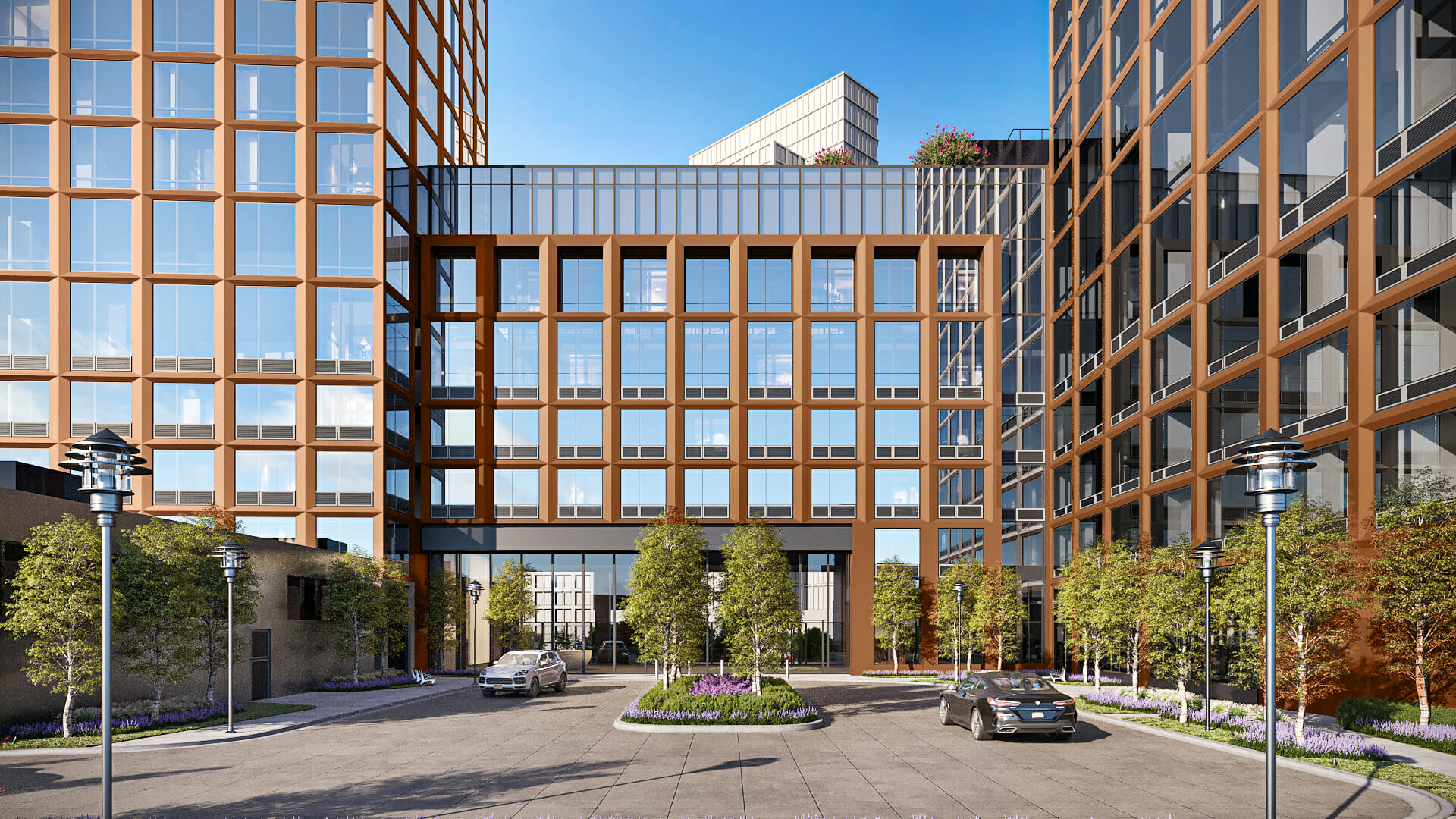 Across the tower and podium facades, a uniform, sculptural grid of vertical pilasters and horizontal spandrels are rendered in a warm metallic tone, which serves as a modern expression of the natural earth-toned, brick palette of the historic architecture of Greenpoint. Each tower is slightly faceted on each side to capture light and shadow throughout the day, and oversized window openings bathe apartments and amenity spaces in natural light. Bright reflective glass, expressed in these window openings within the façade and unveiled at the top of each tower, connects the buildings to the water and sky above by mirroring their ever-changing colors and patterns.